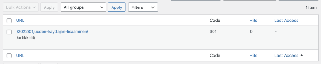 Redirect asetuksissa “Redirect” valikossa näkyvät jo luodut uudelleenohjaukset ja mm. tieto siitä, milloin uudelleenohjausta on viimeeksi käytetty ja “Hits” montako kertaa yhteensä. URL sarakkeessa näkyy päälimmäisenä linkkinä se osoite josta ohjataan alempaan. Klikkaamalla linkkiä voit testata toimiiko uudelleenohjaus.